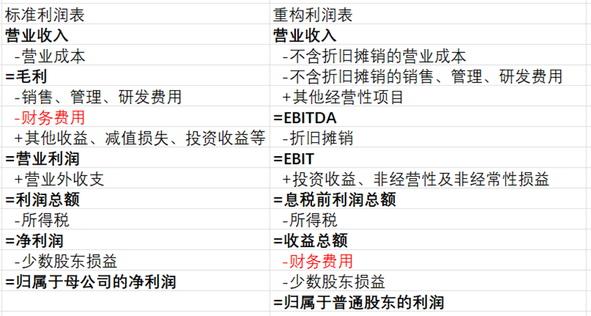 利润表存在的意义是告诉我们利润的详细产生过程,但问题的关键在于这个利润究竟是谁眼中的利润?标准的利润表与重构后的利润表格式对比如下图: