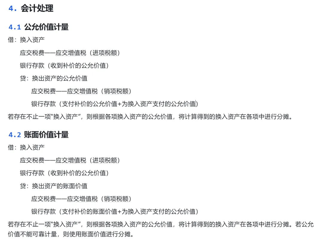 若非货币性资产交换不同时满足交换具有商业实质+换入或换出资产的公允价值可以可靠计量,那么以换出资产的账面价值和支付的税法(契税、车辆购置税等,不含增值税)作为换入资产的成本。