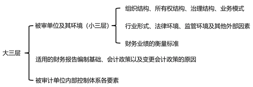 这里就是介绍了我们应该从哪些方面了解被审计单位,总体要求是从"大三层,小三层"进行了解。